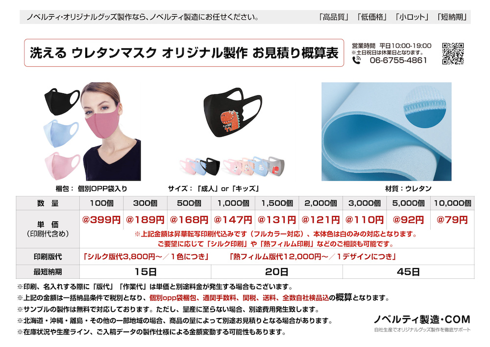 清潔な洗えるウレタン材質の立体マスクをオリジナル名入れ印刷・製作します。