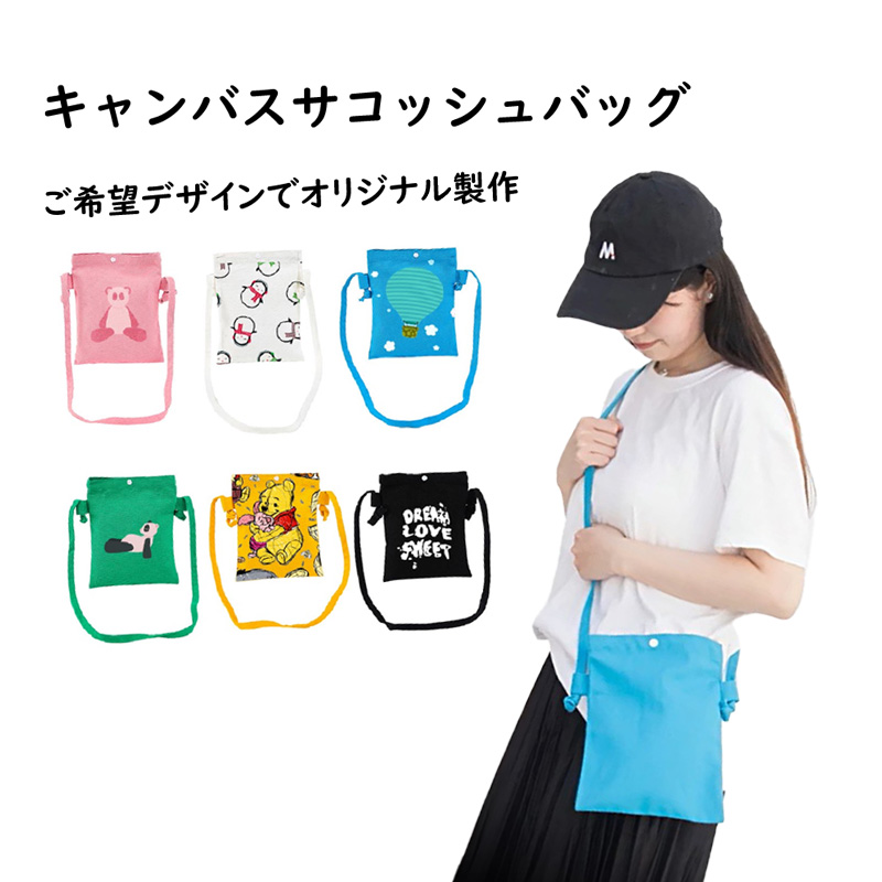 丈夫なキャンバス素材のサコッシュバッグは、販促品や同人グッズ、イベント、コンサートやライブのグッズ販売にも最適です。