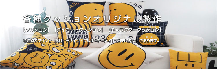 クッション・枕クッション・キャラクターの形にしたダイカットクッションなどのオリジナルクッション特集です。クッションの製作ならノベルティ製造にお任せ下さい。フルカラー印刷やサイズ指定、素材変更など、フルオーダーメイド製作まで対応しており、小ロットから短納期で全数検品の高品質なグッズを低コストでお届けします。